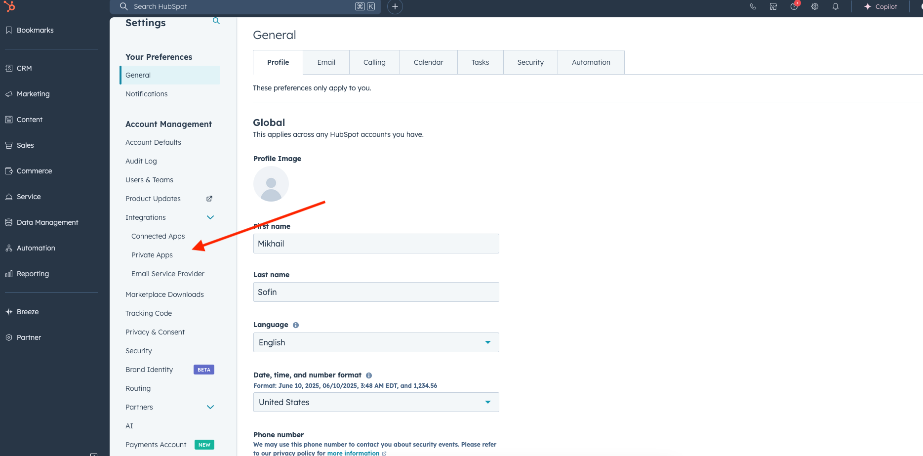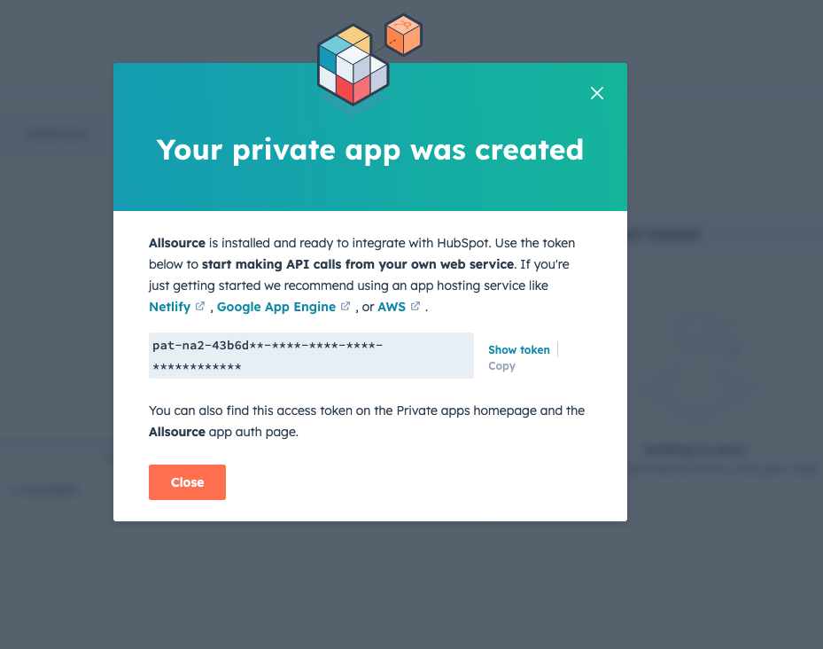 After creation, HubSpot will generate a Private App API Key.