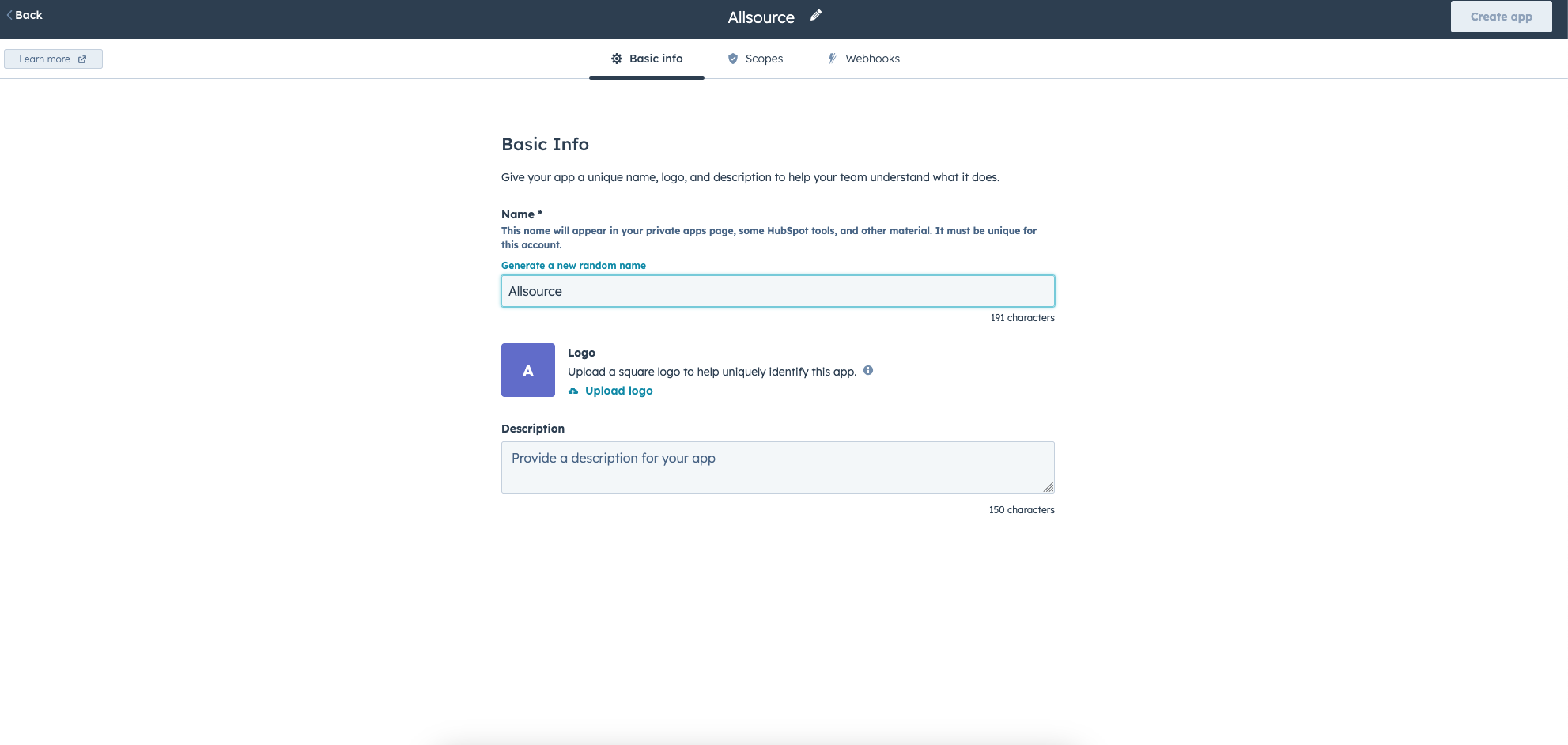 Enter "Allsource" as the app name to easily identify it later.