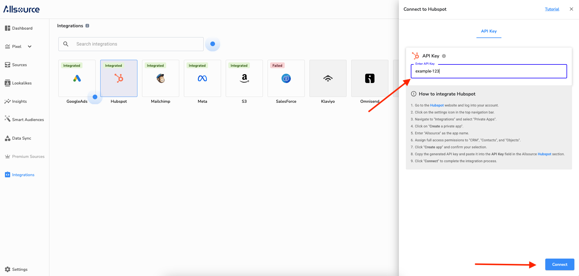 Go to the HubSpot integration section in Allsource, and paste the API key into the API Key field.