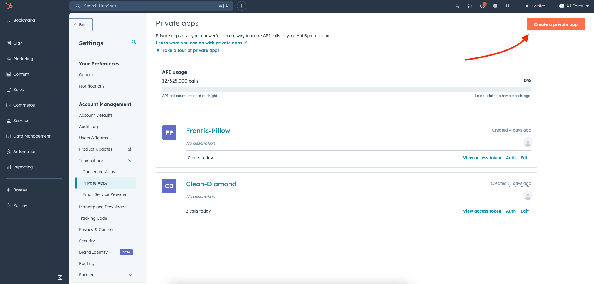 In the left-hand menu, navigate to "Integrations", then click on "Private Apps".