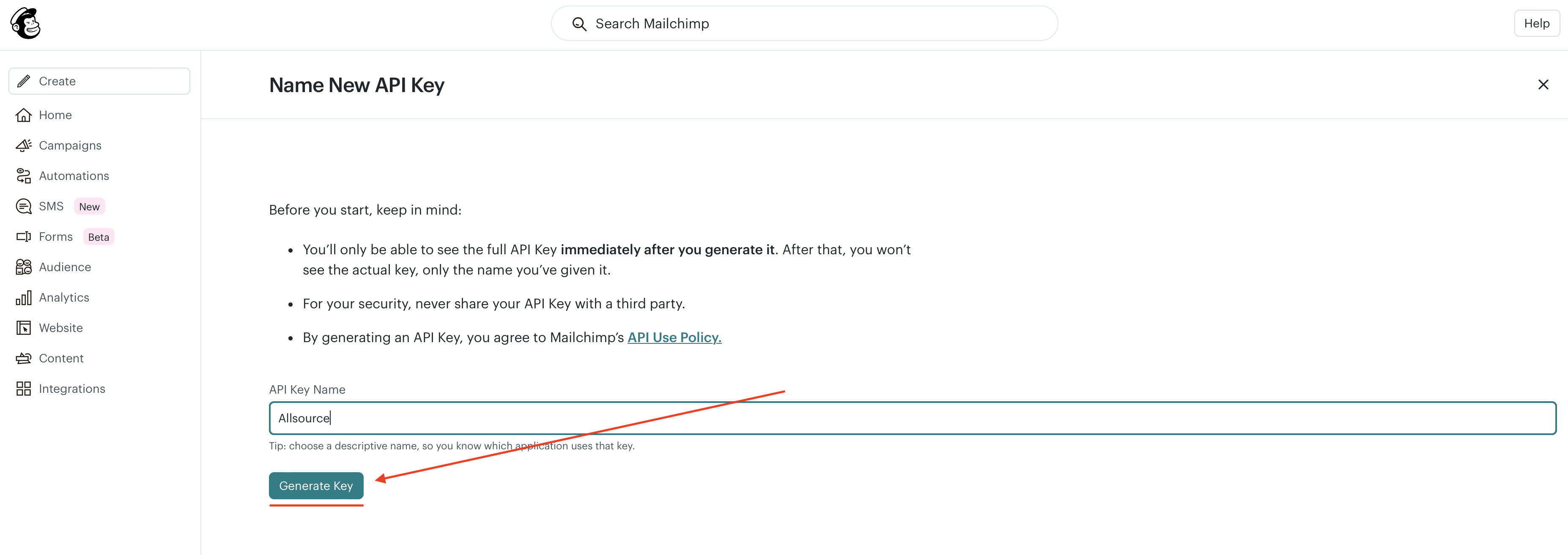Mailchimp will ask you to name your key (e.g., "Allsource")