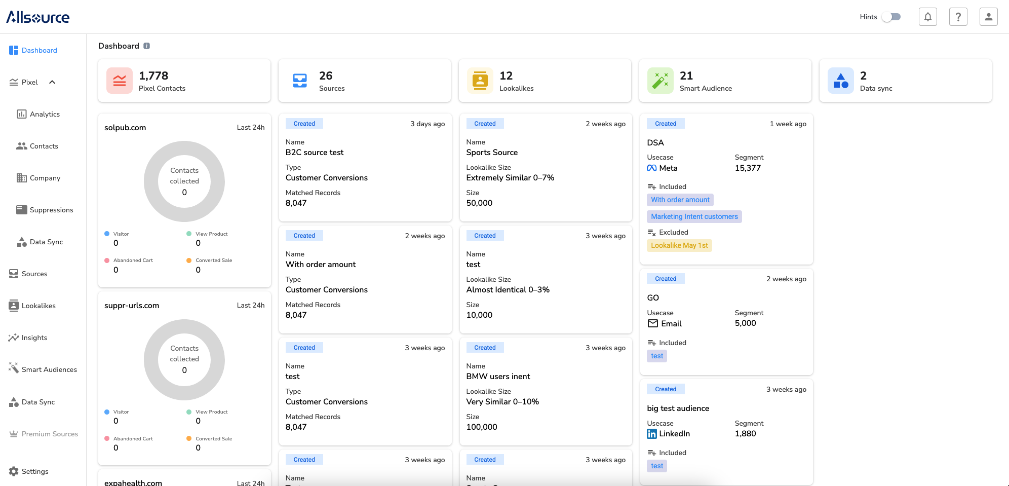 The Audience Dashboard provides a central hub to manage and analyze your customer data, sources, audience segments, and synchronization processes. This dashboard is essential for understanding how your pixel and data sources contribute to audience creation and growth.