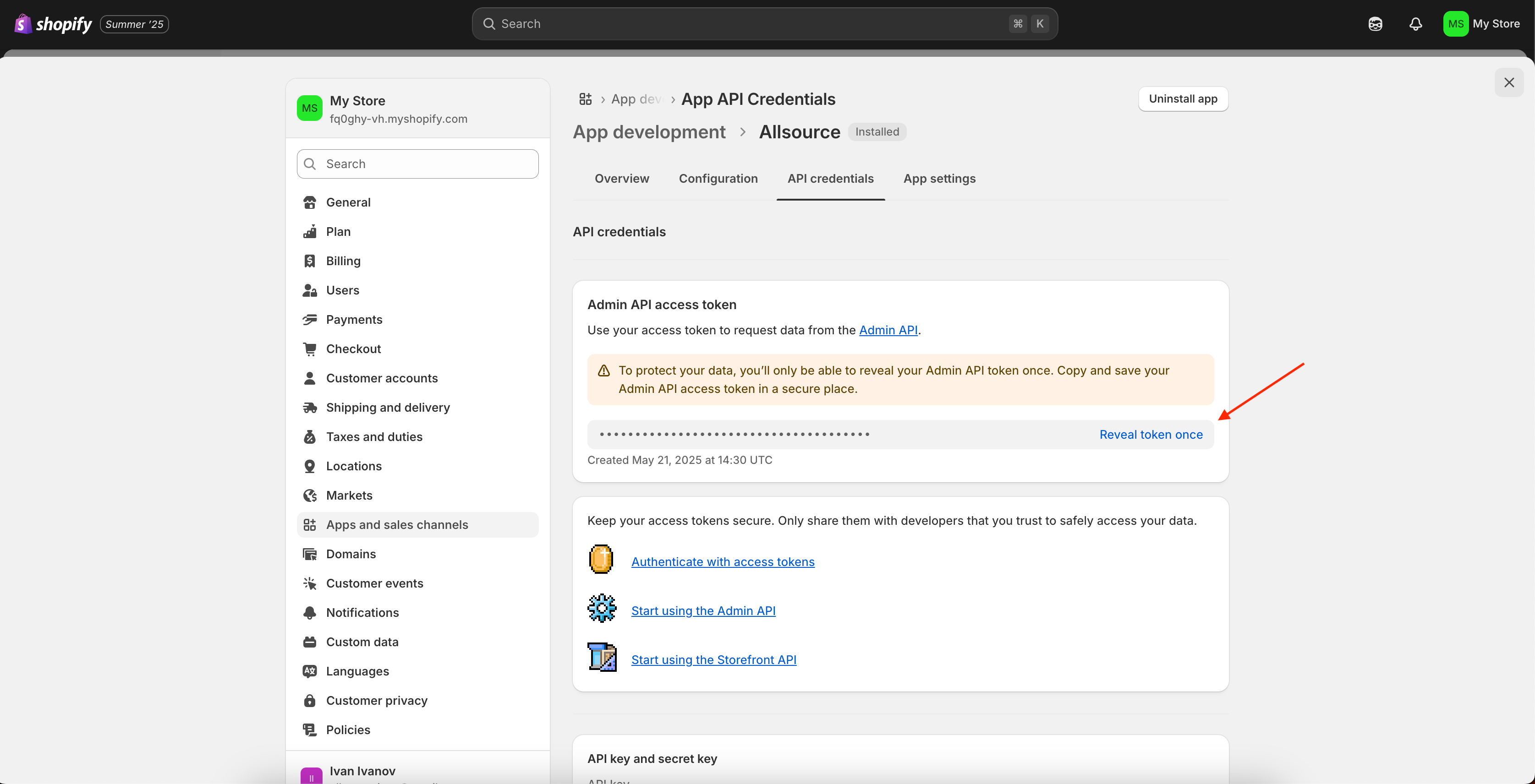 Click Reveal token once to display your Admin API access token.