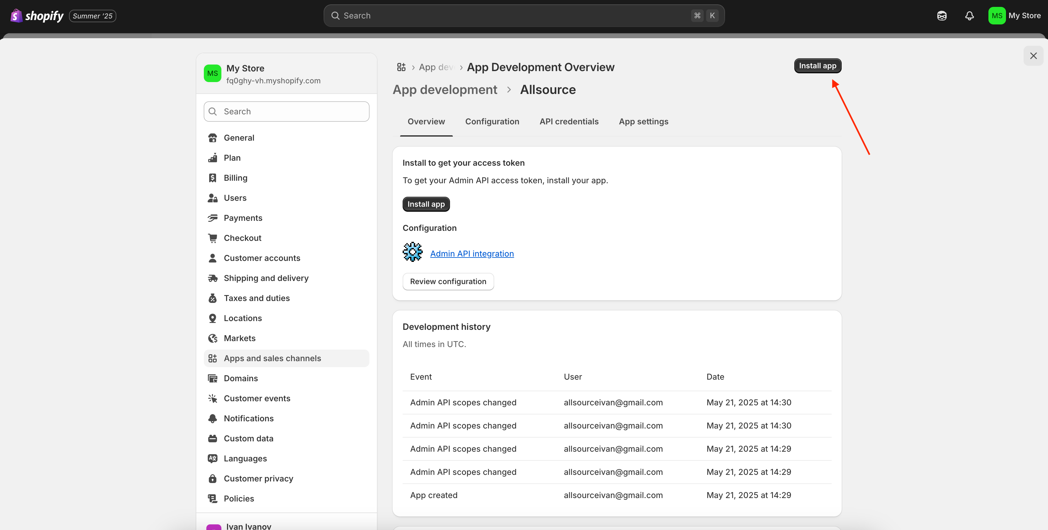 In your app's overview page, click Install app.