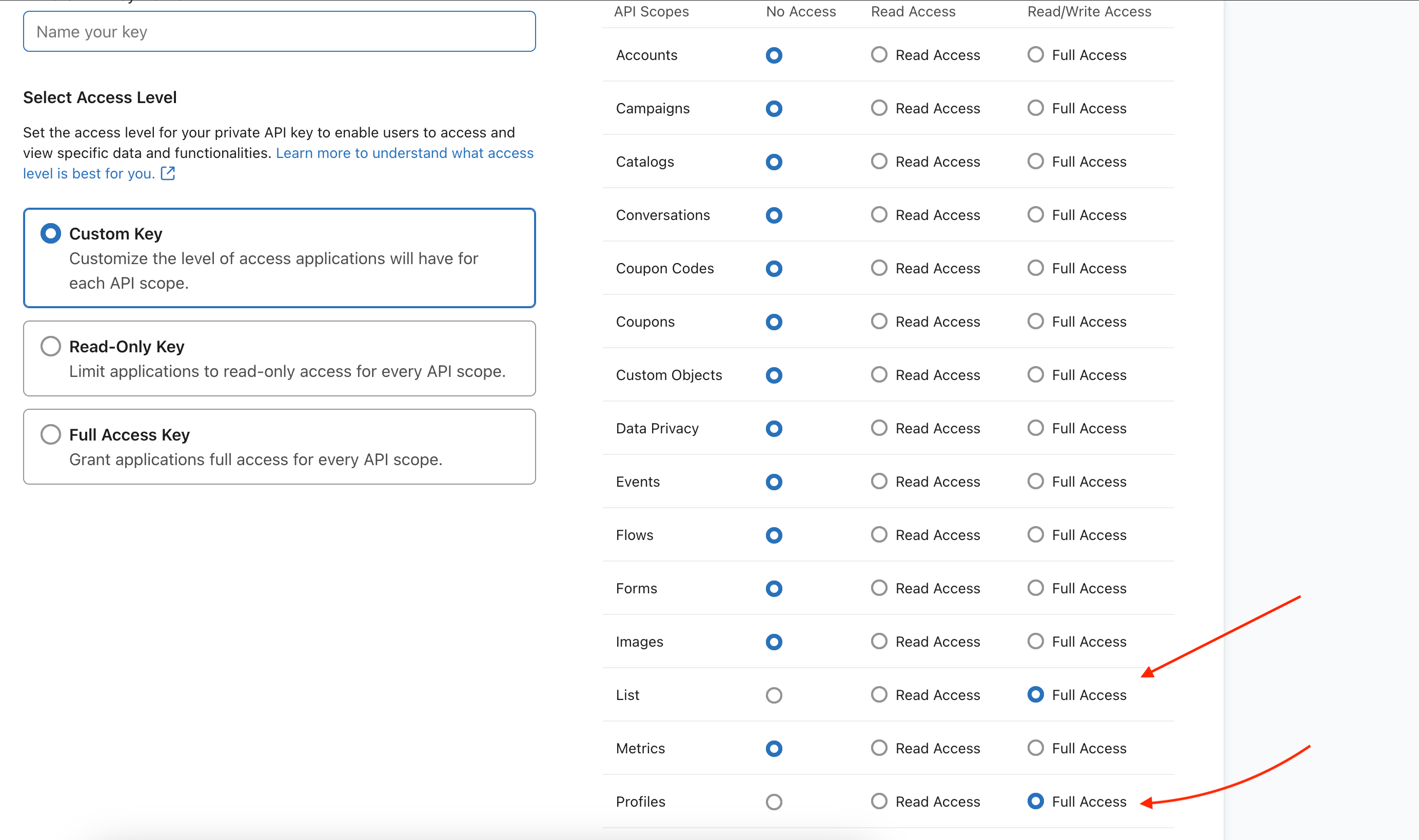 Please note that with Klaviyo API keys, permissions are usually set at the key level. For OAuth tokens, make sure the required scopes are requested during authorization.